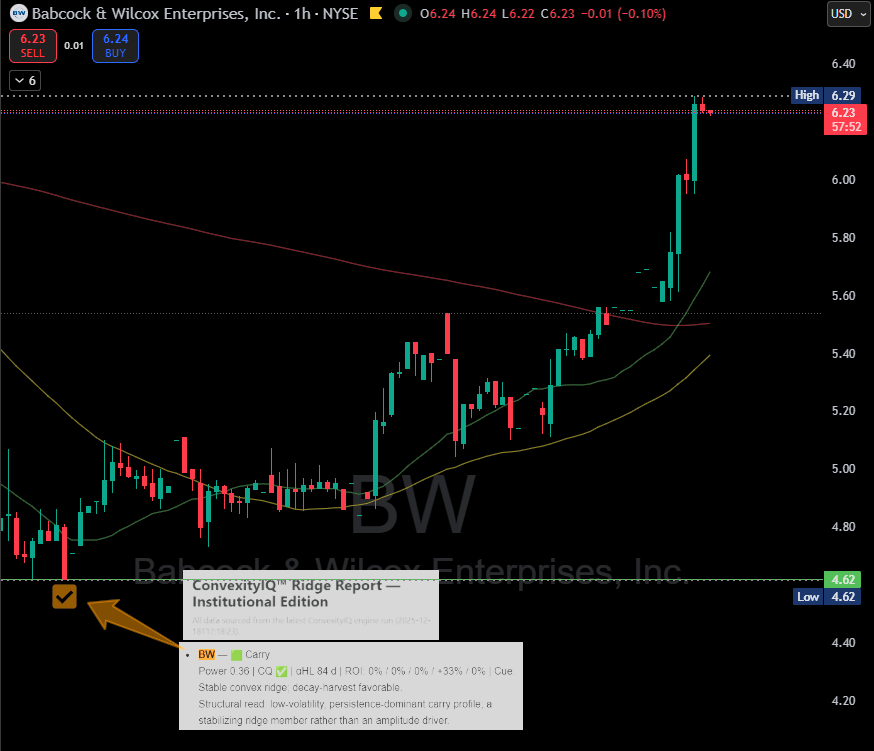 In late-December 2025, Babcock & Wilcox Enterprises, Inc. (BW) began a decisive upside repricing, advancing +34.8% from the level at which ConvexityIQ™ had already classified the underlying as Carry-regime convexity. The move appeared abrupt on the chart, but from a structural convexity perspective, it was neither random nor surprising.
